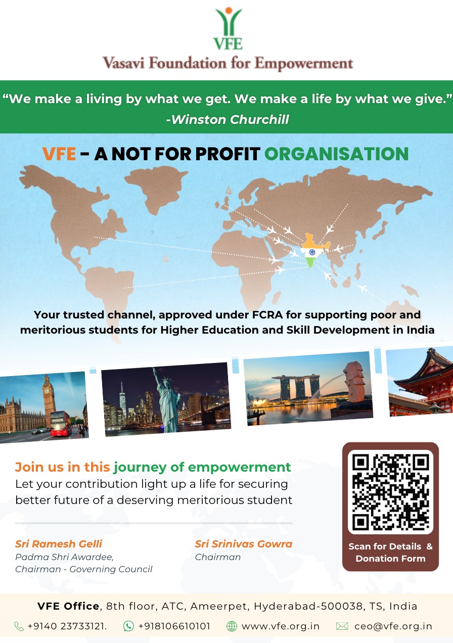 Vasavi Foundation for Empowerment (VFE) was established to empower individuals. Our support systems are designed to provide worthy candidates all assistance and support required to excel and achieve their goals.